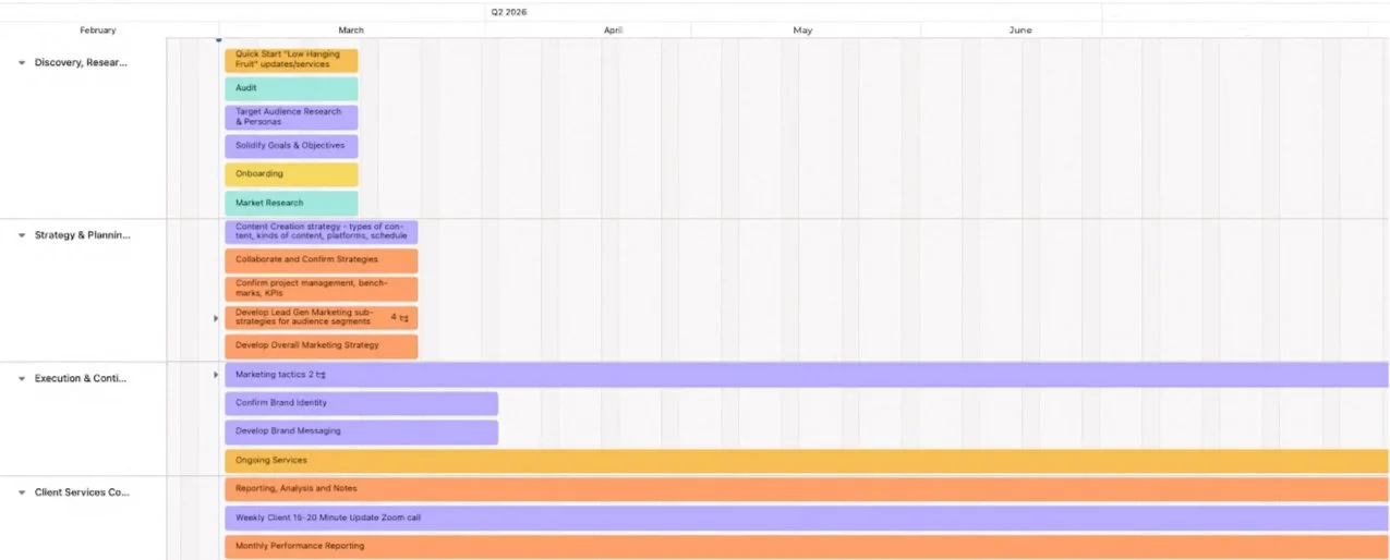 Strategy-first approach: work big to small. Macro to Micro. The biggest gaffe in the outsourced marketing services sector is focusing on tactics to begin. Our approach is the following 6 phases: