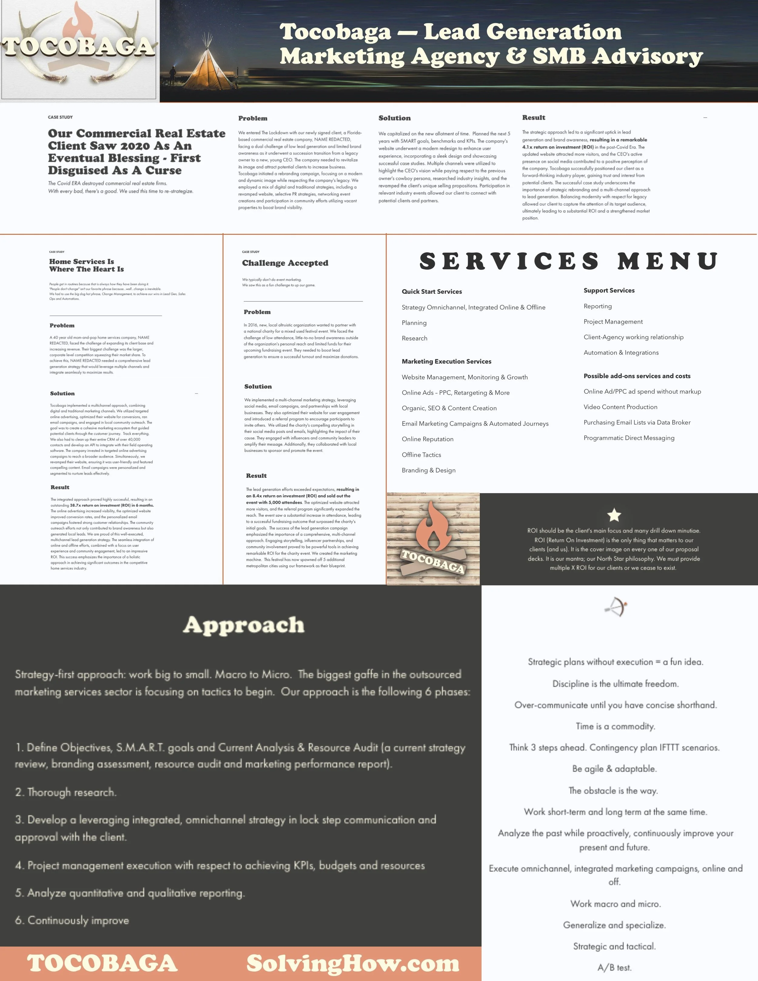 We entered The Lockdown with our newly signed client, a Florida-based commercial real estate company, NAME REDACTED, facing a dual challenge of low lead generation and limited brand awareness as it underwent a succession transition from a legacy owner to a new, young CEO. The company needed to revitalize its image and attract potential clients to increase business. Tocobaga initiated a rebranding campaign, focusing on a modern and dynamic image while respecting the company's legacy. We employed a mix of digital and traditional strategies, including a revamped website, selective PR strategies, networking event creations and participation in community efforts utilizing vacant properties to boost brand visibility.